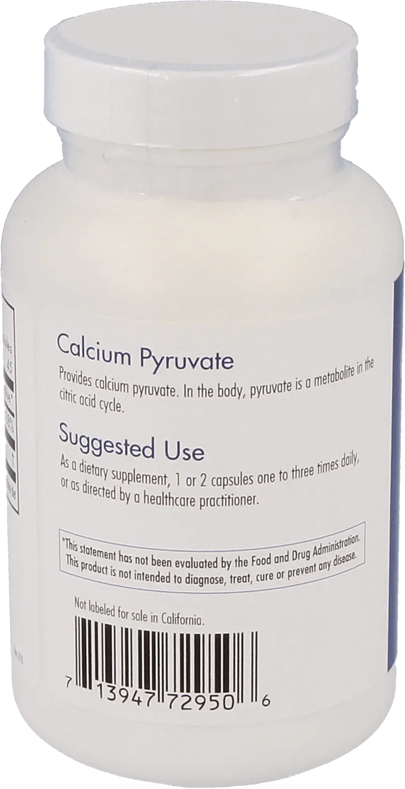 contains 140mg of calcium per capsule. Pyruvate is a key substance for cellular energy production. It is first converted to acetyl-CoA and then to either ATP or lactate.
