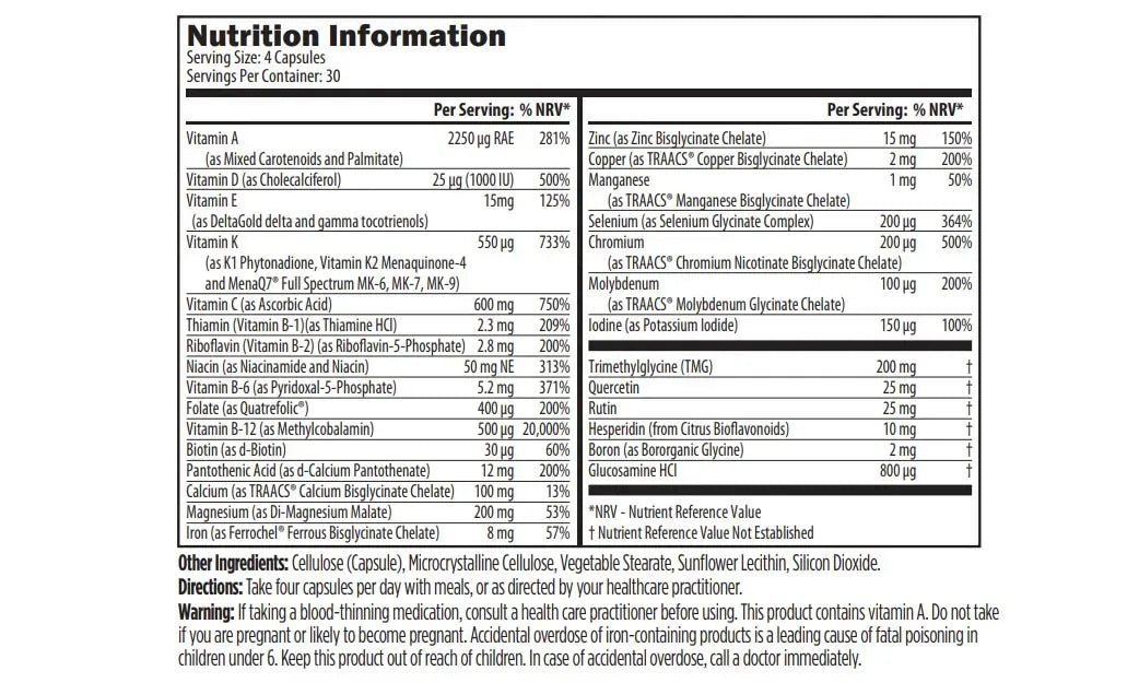 Vitamin C: provided as ascorbic acid, at higher levels than in most multivitamins. This generous amount may help support numerous roles for vitamin C such as a healthy immune system, skin and blood vessels, synthesis of collagen, aiding in iron absorption and metabolism of catecholamines such as dopamine and adrenaline.*