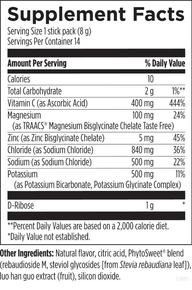 This product delivers 2X the electrolytes of the leading electrolyte powder brand and 9X the electrolytes of the leading sports drink.† It uniquely features sodium and potassium in a 1:1 ratio for more optimal, balanced electrolyte replacement. It features D-ribose, a key component in ATP synthesis to promote cellular energy production, in addition to vitamin C, a potent antioxidant for post-exercise recovery support. It may support individuals performing physical activity, living/working in warm temperatures, using the sauna, or those with occasional diarrhea.