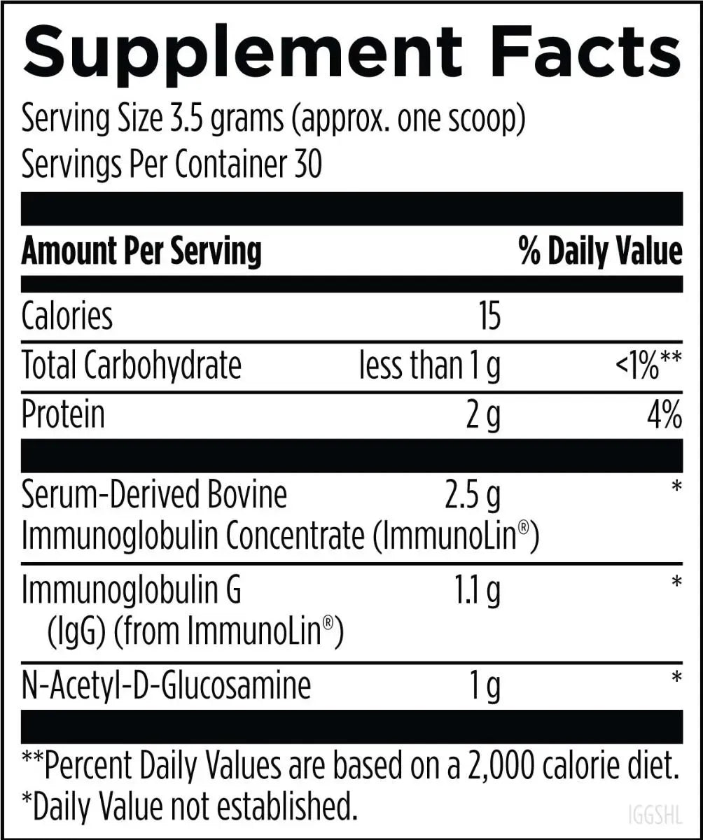 IgGI Shield™ combines ImmunoLin® with N-acetyl-D-glucosamine to support the structure of the cells of the intestinal lining and to promote a healthy inflammatory response in the cells of the gastrointestinal (GI) tract. These ingredients work together to provide support to the intestinal barrier and to support gut immune health. ImmunoLin®, a serum-derived bovine immunoglobulin concentrate (SBI), is the only purified, dairy-free source of immunoglobulin G (IgG) available as a dietary supplement. Immunoglobulins play an integral role in the support of healthy immune function at the gut and systemic levels. N-acetyl-D-glucosamine promotes healthy immune function by promoting a balanced immune response.