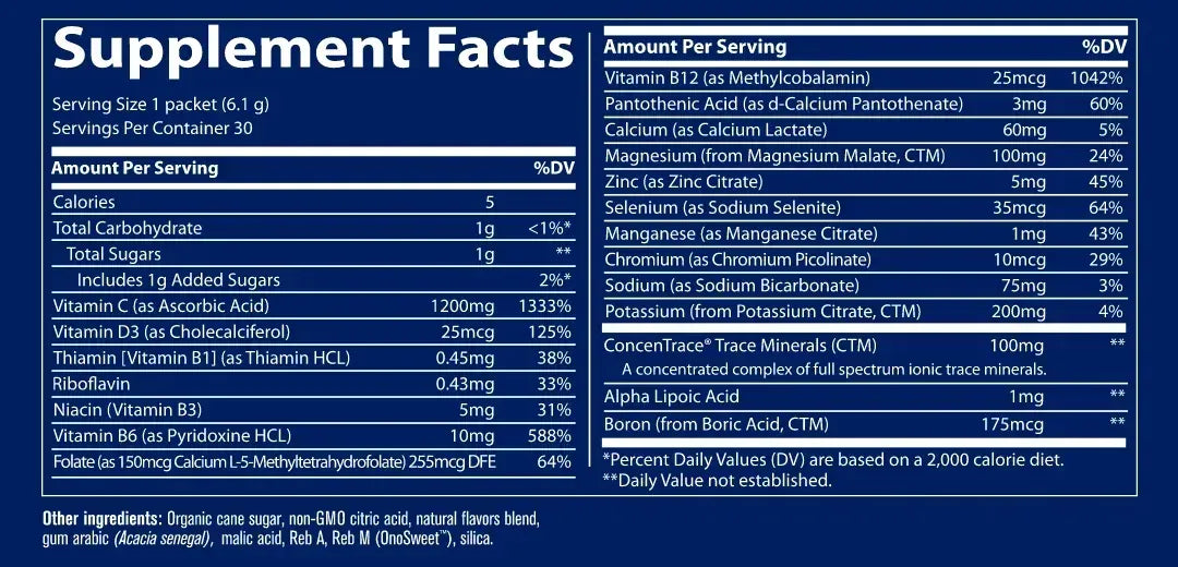 Power Paks give your water a delicious mineral boost and replenish your body with a naturally flavored, effervescent electrolyte drink featuring 1,200 mg of vitamin C plus manganese, selenium, elderberry, zinc, vitamins D3, B6, B12, and a full spectrum of ionic trace minerals.
