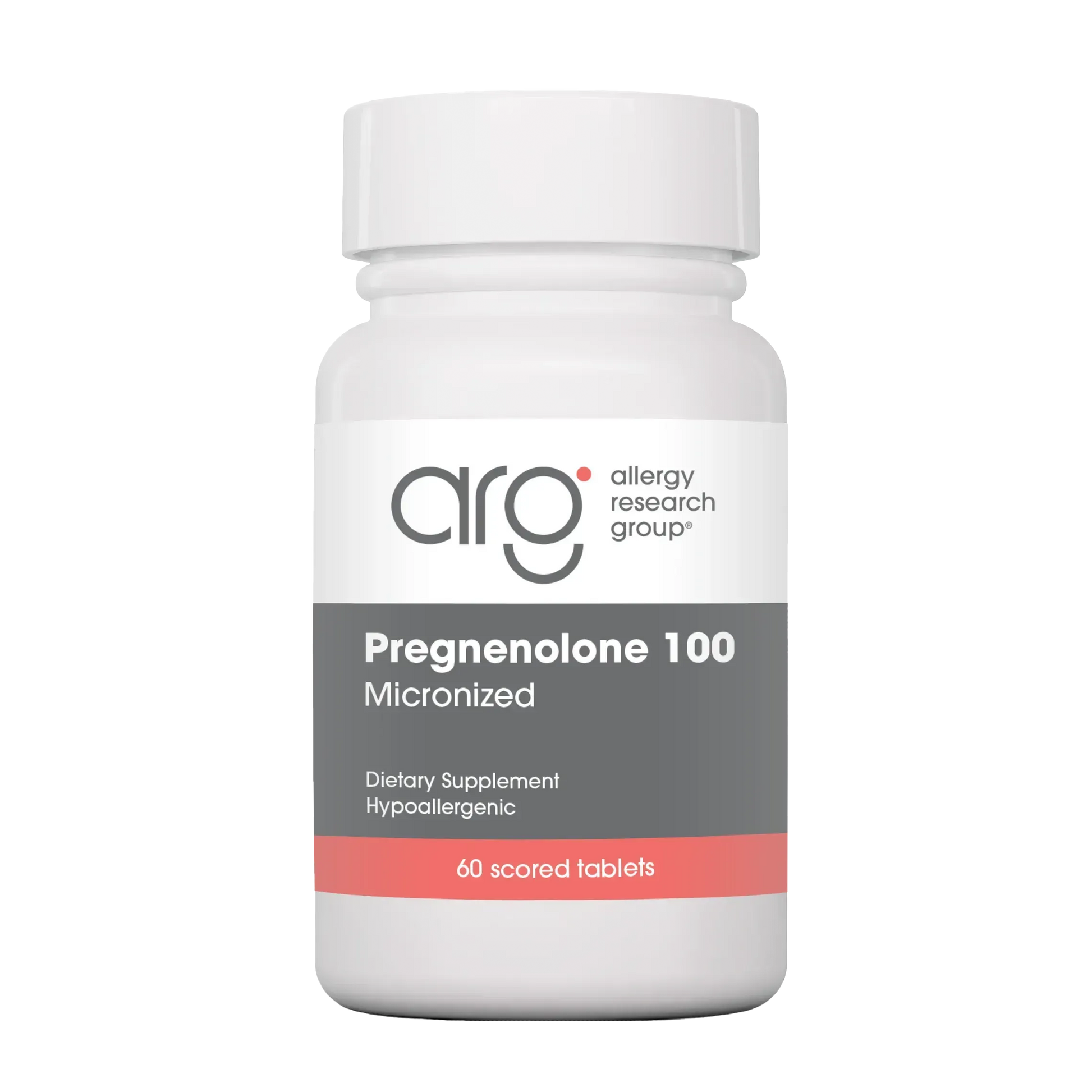 Pregnenolone 100 by Allergy Research Group is a micronized, plant-sourced pregnenolone formulated in a lipid matrix to bypass the liver, with a particle size of less than 50 microns. The tablets are soy free, the source material (wild yam) is non-irradiated and non-ethylene-oxide-treated.
