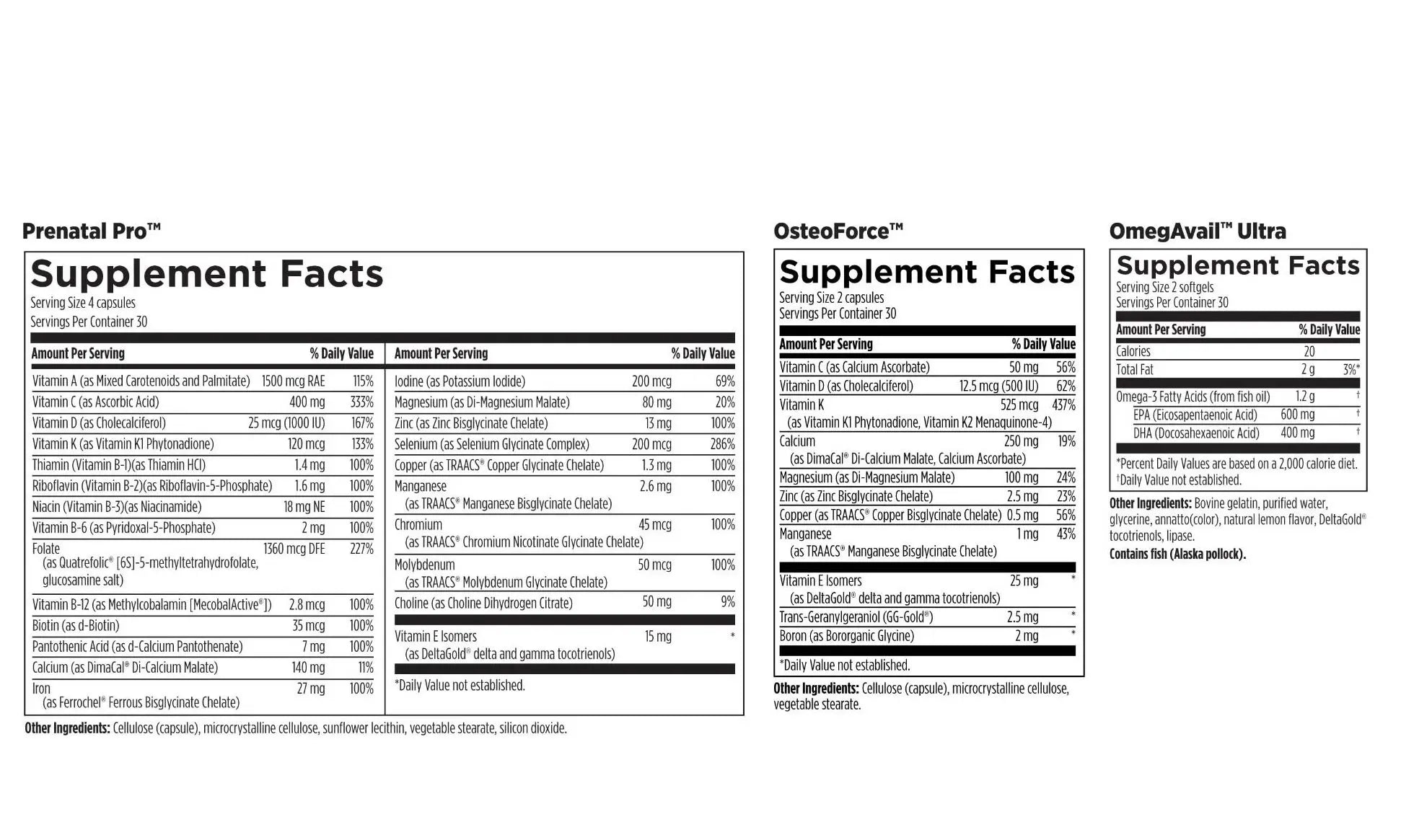 Inside the womb, a developing baby’s entire food supply comes from its mother. In order to give her baby the best start in life, it is essential for a woman to have optimal nutrition herself, preferably in advance of becoming pregnant. The foundation of a healthy pregnancy is a nutrient-dense diet based on whole, unprocessed foods. However, even a well-formulated diet may have shortfalls of nutrients required for healthy fetal development, which may have long-term repercussions in childhood and beyond. Prenatal Pro™ is a multivitamin and mineral formula designed to provide mom and baby with appropriate amounts of key nutrients during this critical time.