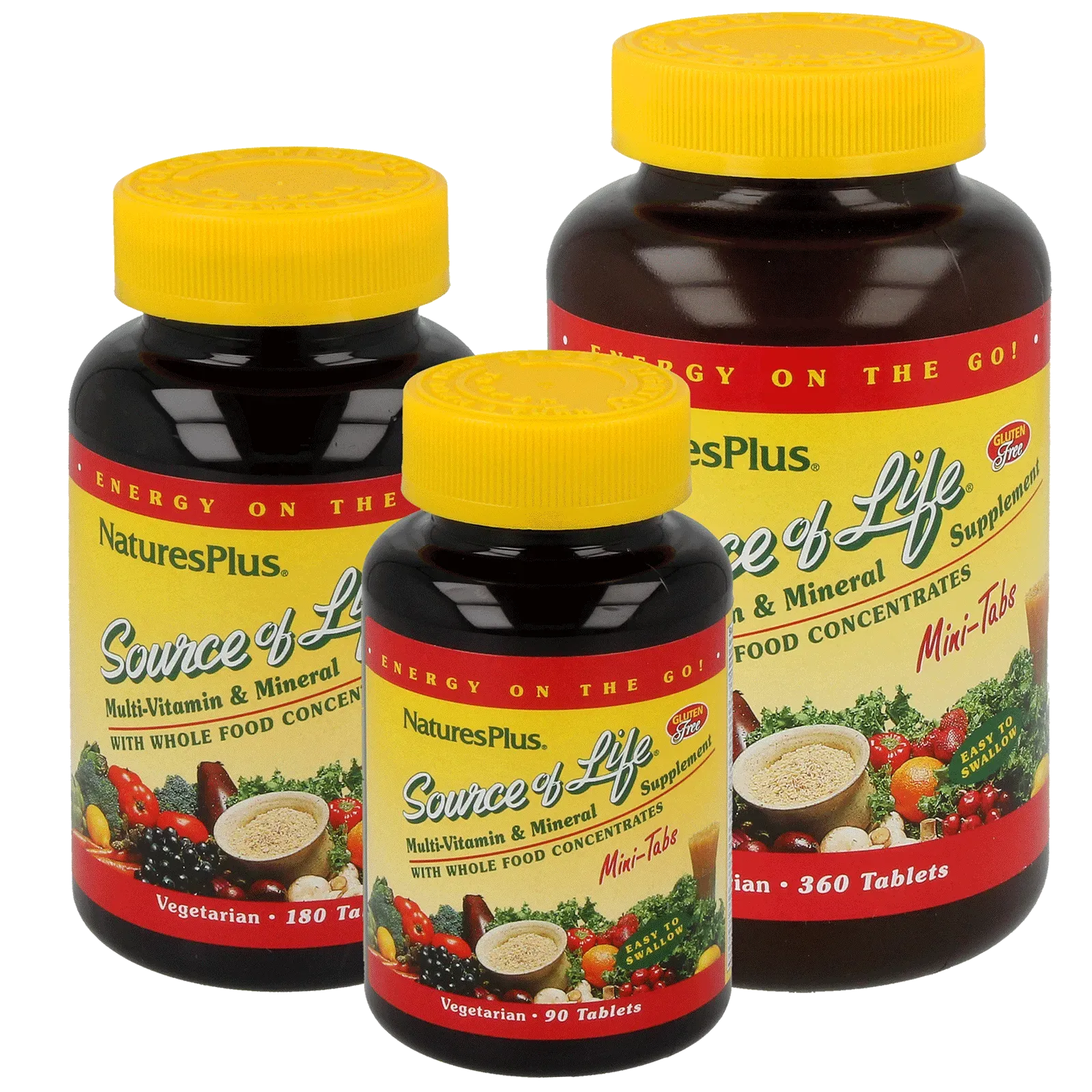Source of Life® by NaturesPlus is a comprehensive multivitamin with vitamins, minerals and bioactive compounds from whole food concentrates. The product contains 90/180/360 mini tablets per pack.
