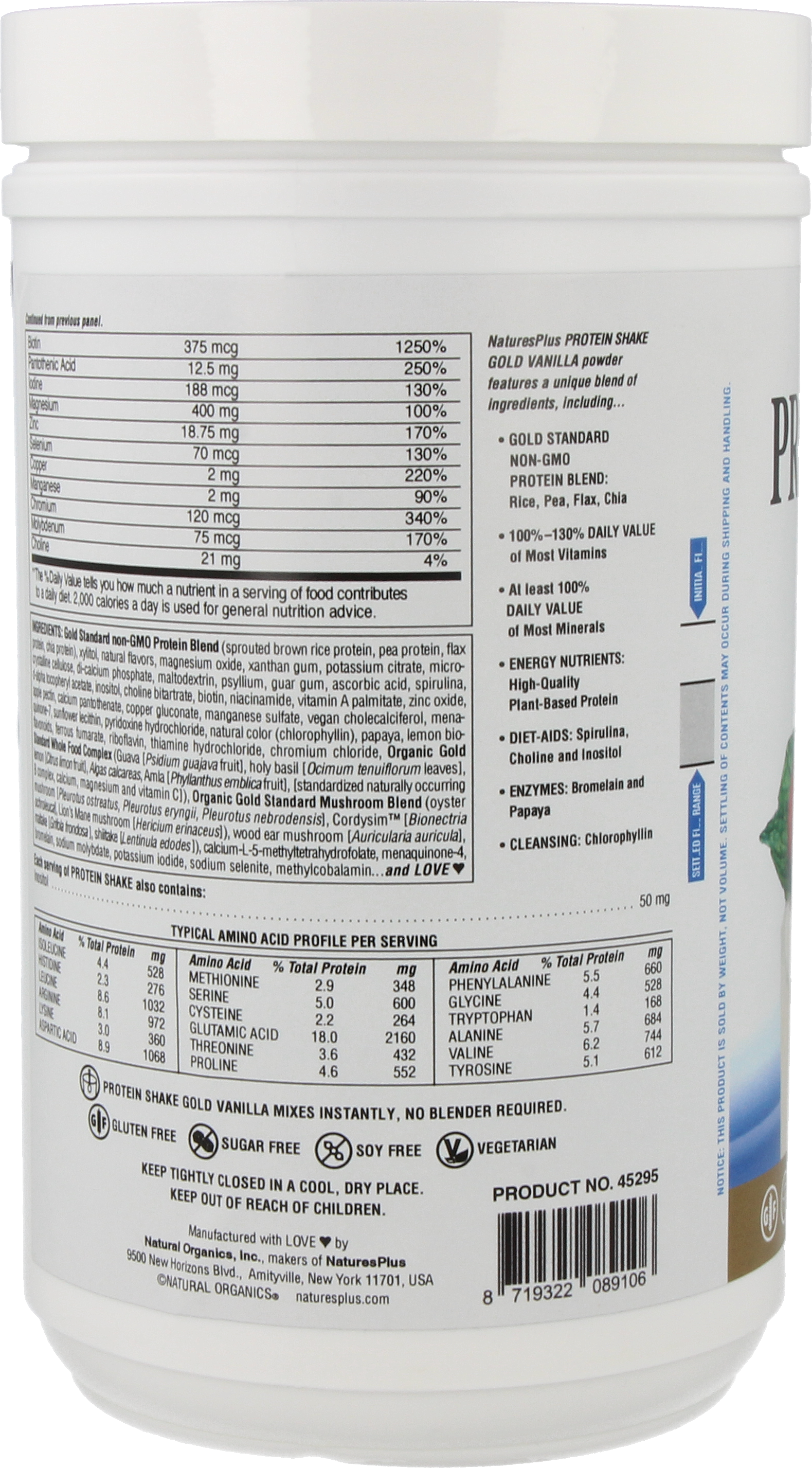Eiweiß ist das wichtigste Strukturelement aller Körperzellen, insbesondere der Muskelzellen. Durch den Verdauungsprozess werden Nahrungsproteine in einzelne Aminosäuren zerlegt, die dann zur Bildung von Nukleinsäuren, Enzymen, Hormonen, Neurotransmittern und Blutzellen sowie zur Zellreparatur, zum Nerven- und Immunsystem verwendet werden. Tierisches Eiweiß stammt hauptsächlich aus Fleisch, Eiern oder Milch, während pflanzliches Eiweiß aus Reis, Soja oder Hülsenfrüchten wie Erbsen gewonnen wird. Tierisches Protein bietet in der Regel ein höheres Qualitätsprofil von Aminosäuren. Dieser Unterschied kann jedoch durch die Kombination ausgewählter pflanzlicher Proteine ausgeglichen werden. Eine Portion Protein Shake Gold Vanilla liefert 12 g sojafreies GOLD-Standardprotein aus gentechnikfreiem Chia (Salvia hispanica), Reis, Erbsen und Flachs sowie ein breites Spektrum an Vitaminen, Mineralstoffen und weiteren Vitalstoffen. Damit ist es ein vollwertiger, fettfreier Mahlzeitenersatz mit 94 Kalorien.