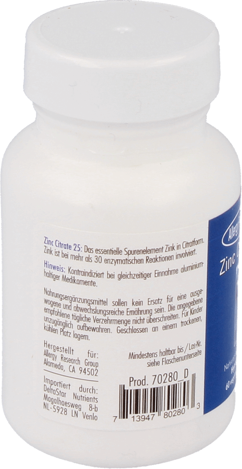 Was ist Zink? Das essenzielle Spurenelement Zink ist u.a. als Bestandteil und Aktivator zahlreicher Enzyme an vielen Prozessen im menschlichen Organismus beteiligt. So hilft es beim Auf- und Abbau von Kohlenhydraten, Fetten und Eiweiß. Außerdem spielt es eine Rolle für das Wachstum, das Immunsystem, die sexuelle Entwicklung und Fruchtbarkeit sowie für das Empfinden von Geschmack und Appetit. Zink ist ebenso am antioxidativen Schutzsystem gegen freie Radikale beteiligt und unterstützt darüber hinaus die Knochen. Es spielt eine Rolle bei geistiger Anstrengung und Aktivität sowie in Stresssituationen. Da im Körper nur begrenzte Zinkspeicher vorhanden sind und diese bei einer Unterversorgung nur schwer mobilisiert werden können, ist eine kontinuierliche Zufuhr über die Nahrung ganz besonders wichtig. Zink in unserer Nahrung Tierische Produkte sind die Hauptlieferanten für Zink. Gute Quellen sind v.a. Rindfleisch, Schweinefleisch, Geflügel, Meeresfrüchte wie Krabben oder Hummer, Eier, Milch und Käse. Allgemein kann Zink besser aus tierischen als aus pflanzlichen Lebensmitteln aufgenommen werden. Bei den pflanzlichen Nahrungsquellen für Zink stehen Getreideprodukte und Nüsse im Vordergrund. Zink als Supplement Zink Citrate von Allergy Research Group® liefert 25 mg elementares Zink pro Kapsel. Citrate, d.h. Verbindungen aus Mineralstoffen wie Zink und Zitronensäure, gelten als gut bioverfügbar sowie gut verträglich. Eine Verpackung enthält 60 Kapseln.Hinweis: Nahrungsergänzungsmittel sollen kein Ersatz für eine ausgewogene und abwechslungsreiche Ernährung sein.