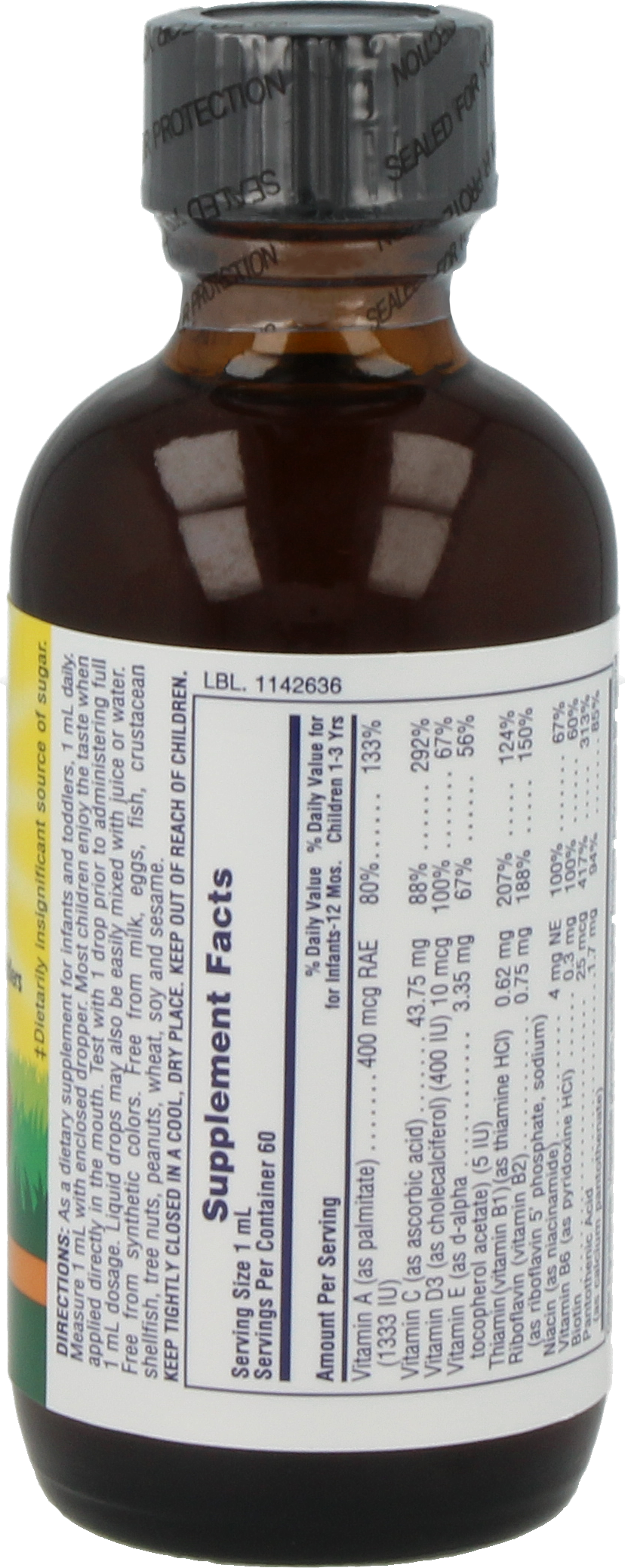 Ingrediënten: Vitamine A (als retinylpalmitaat), Vitamine B1 (als thiaminehydrochloride), Vitamine B2 (riboflavine), Vitamine B3 (als niacinamide), Vitamine B5 (pantotheenzuur), Vitamine B6 (als pyridoxine hydrochloride), Vitamine B12 (als cyanocobalamine), Biotine, Choline (als bitartraat), Vitamine C (ascorbinezuur), Vitamine D3 (cholecalciferol), Vitamine E (als D-α-tocoferol), Glycerol, Fructose, Kaliumsorbaat, Natriumbenzoaat, Sinaasappelaroma, Polysorbaat-80, Water