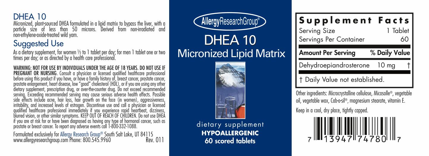 DHEA Lipid Matrix van Allergy Research Group® is verkrijgbaar in doseringen van 10, 15, 25 en 50 mg per tablet. Per verpakking bevat dit product 60 vegetarische tabletten. Het product is hypoallergeen en glutenvrij.